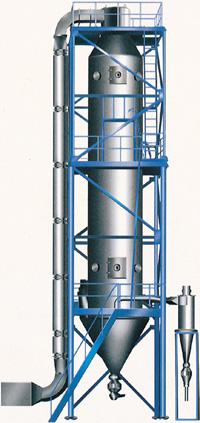 壓力式噴霧干燥造粒機是采用壓力式霧化器借助隔膜泵的壓力將溶液或漿狀的物料霧化成細微液滴,使表面積顯著增大,經與熱風進行充分熱交換得以快速干燥(十幾秒至幾十秒),從而得到粉體或細小顆粒產品的設備。特點: